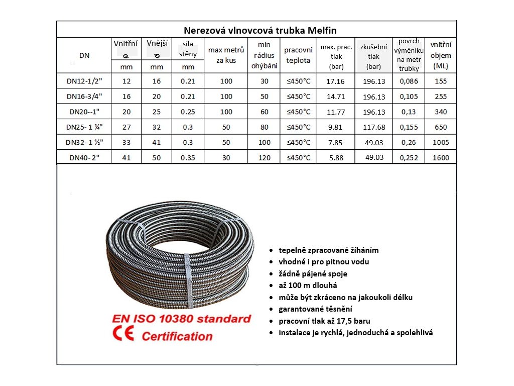 Popis produktu: Vhodný k použití v domácnosti: Vlnovcová trubka DN16 z nerezové oceli SU316L (AISI 316L, 1.4404, ČSN 17349) je ideální pro rychlou instalaci solárních rozvodů, vytápění, výměníků tepla a pitné vody. Trubka je žíhaná při teplotě 1050 - 1100 °C, což výrazně zvyšuje její kvalitu, provozní spolehlivost a životnost. Maximální délka jednoho kusu je 150 metrů.