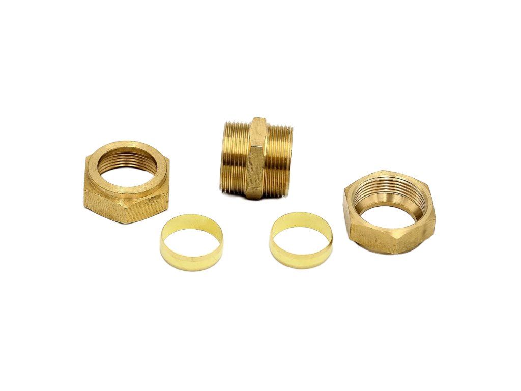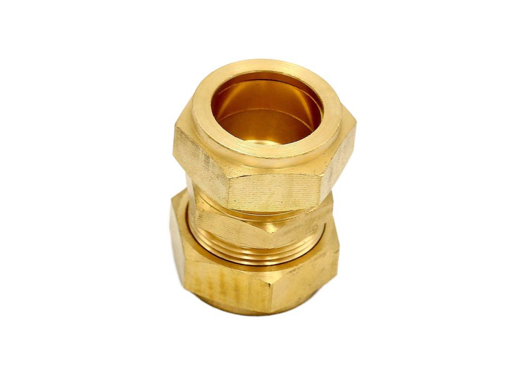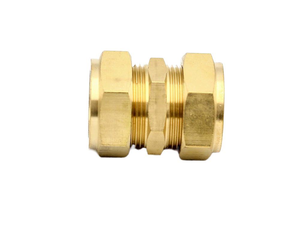 Táto mosadzná kompresná spojka 22 mm slúži na pevné a tesné spojenie dvoch rúr rovnakého priemeru v priamom smere. Je ideálna tam, kde chceš spoj urobiť rýchlo a čisto bez spájkovania – rúrku stačí zasunúť a spoj dotiahnuť maticami.