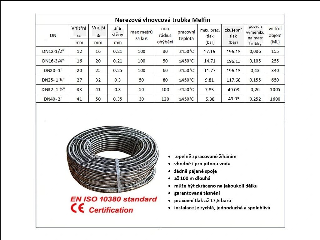 Vlnovcová rúrka DN25 z nehrdzavejúcej ocele AISI 304 je určená pre inštalácie s vysokým prietokom a vyššou záťažou. DN25 sa používa ako hlavný rozvod vo vykurovacích sústavách, na napojenie výmenníkov tepla, veľkých bojlerov, akumulačných nádrží, solárnych systémov alebo technických rozdeľovačov. Vďaka väčšiemu priemeru a robustnej konštrukcii je DN25 vhodná pre profesionálne inštalácie a dlhodobú prevádzku.